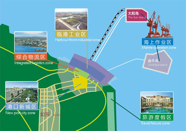 根據(jù)2008年交通運(yùn)輸部和江蘇省人民政府聯(lián)合批復(fù)的《南通港洋口港區(qū)總體規(guī)劃》,港區(qū)劃分為海上作業(yè)區(qū)、臨港工業(yè)區(qū)、綜合物流區(qū)、港口新城區(qū)、旅游度假區(qū)等五大功能區(qū)。 海上作業(yè)區(qū)——兩條航道、兩個人工島、三條岸線。第一人工島(太陽島)規(guī)劃面積2.5平方公里,功能定位以油、氣、大宗干散貨為主體。第二人工島(金牛島)規(guī)劃面積25平方公里,功能定位以修造船和集裝箱為主體。 臨港工業(yè)區(qū)——在洋口港30-45平方公里的臨港工業(yè)區(qū)內(nèi),重點發(fā)展石化、能源、冶金和現(xiàn)代物流,建起一條現(xiàn)代大型產(chǎn)業(yè)支撐的工業(yè)帶。 綜合物流區(qū)——利用港區(qū)功能和政策優(yōu)勢,發(fā)展國際物流和國際中轉(zhuǎn)業(yè)務(wù),向上海經(jīng)濟(jì)圈和長三角地區(qū)腹地延伸。 港口新城區(qū)——推進(jìn)臨港服務(wù)業(yè)的發(fā)展,為港區(qū)提供綜合配套設(shè)施建設(shè),營造良好投資環(huán)境,著力打造資源集約、環(huán)境優(yōu)美、適宜人居的生態(tài)城區(qū)。 旅游度假區(qū)——面向國際國內(nèi)中高端市場,融酒店、商業(yè)、娛樂、社區(qū)為一體,集沿海風(fēng)情和濱海風(fēng)光于一身的綜合型旅游度假區(qū)。